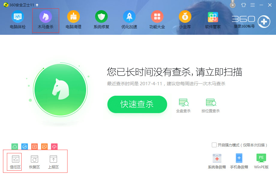 选择 “木马查杀”功能,进入后,在左下角有 “信任区|恢复区|上报区”。点击选择 “信任区”,将“银天下防挟持器.exe”文件,加入信任列表。